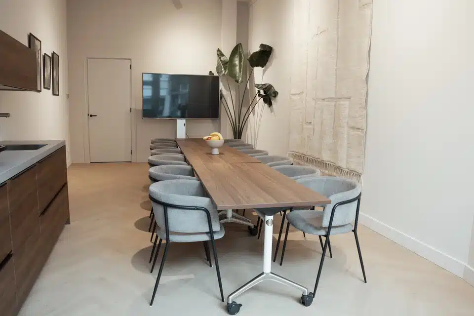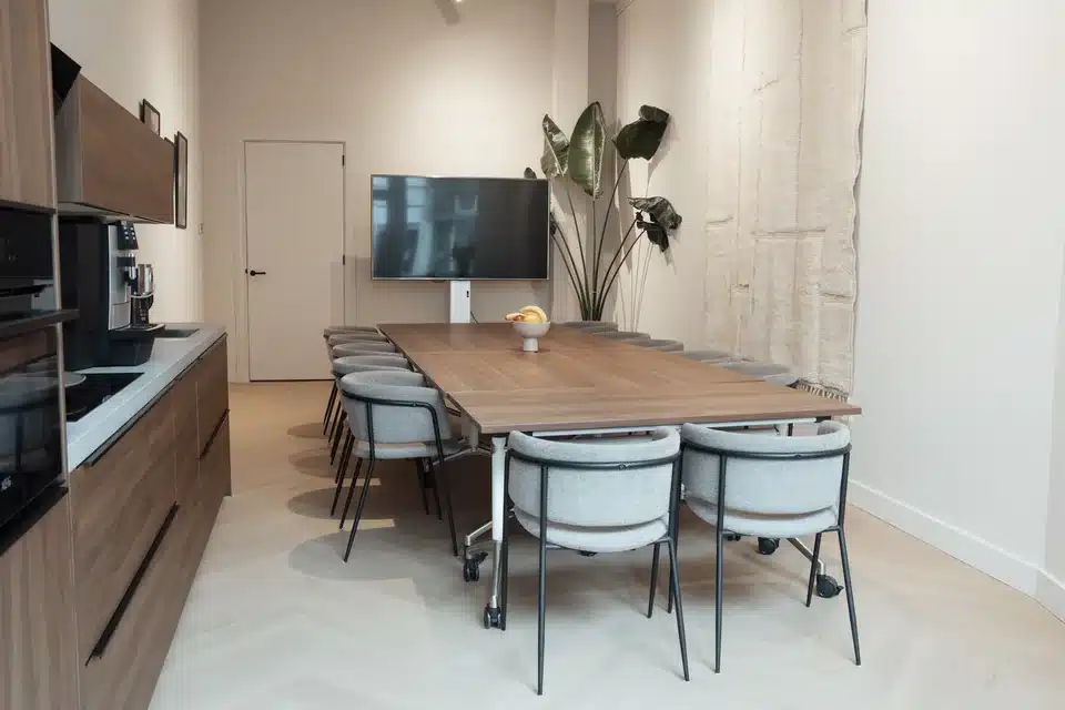 De ruimte is flexibel in te richten met verrijdbare tafels en verschillende opstellingen, aangevuld met comfortabele stoelen die geschikt zijn voor een volledige dag vergaderen. Daarnaast is er een aparte lounge aan de binnentuin, ideaal voor een pauze of informeel overleg.