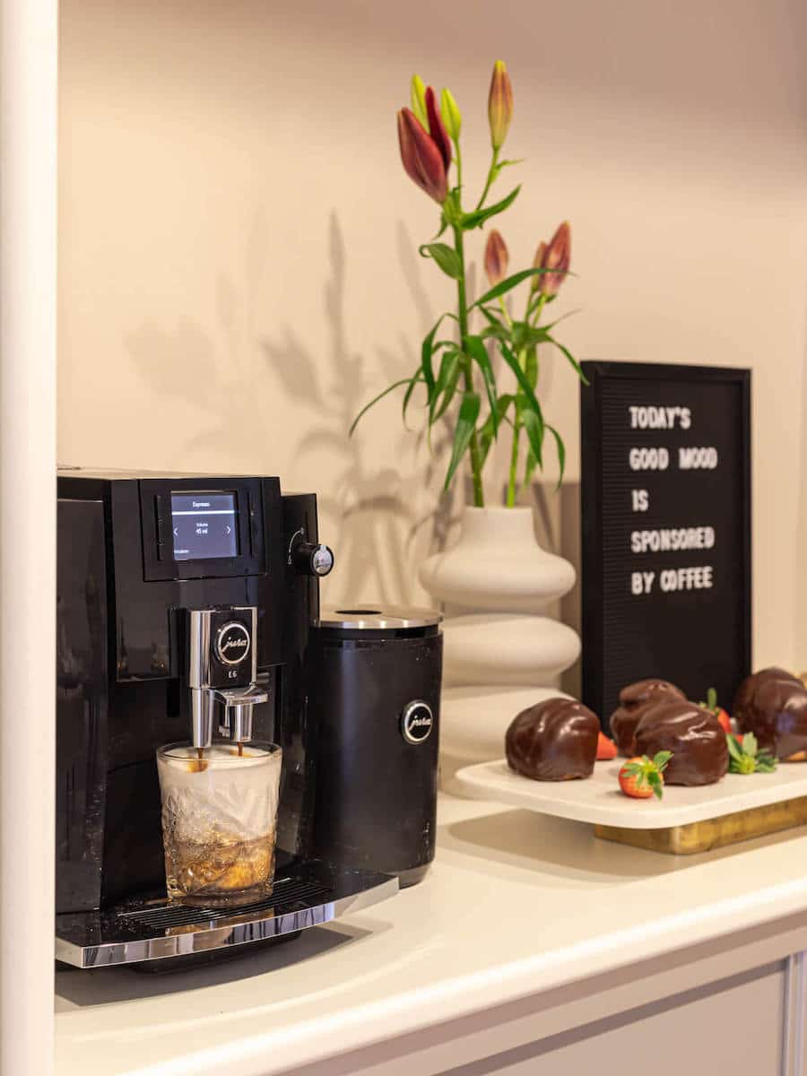 Daarnaast is er een professionele Jura koffiemachine, een breakout room voor 5 personen, een keuken en een rustige tuin.